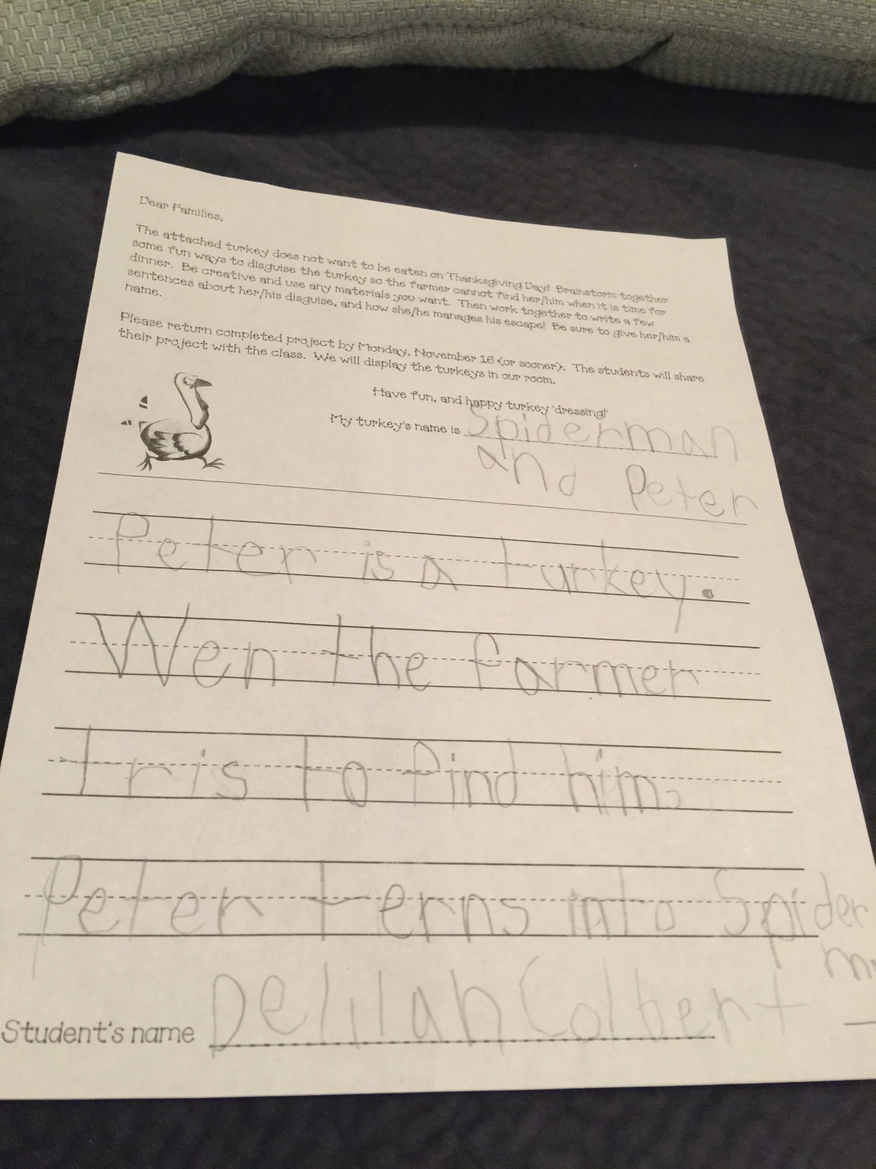 “Peter is a turkey. When the farmer tries to find him, Peter turns into Spiderman. He shoots webs to escape.”