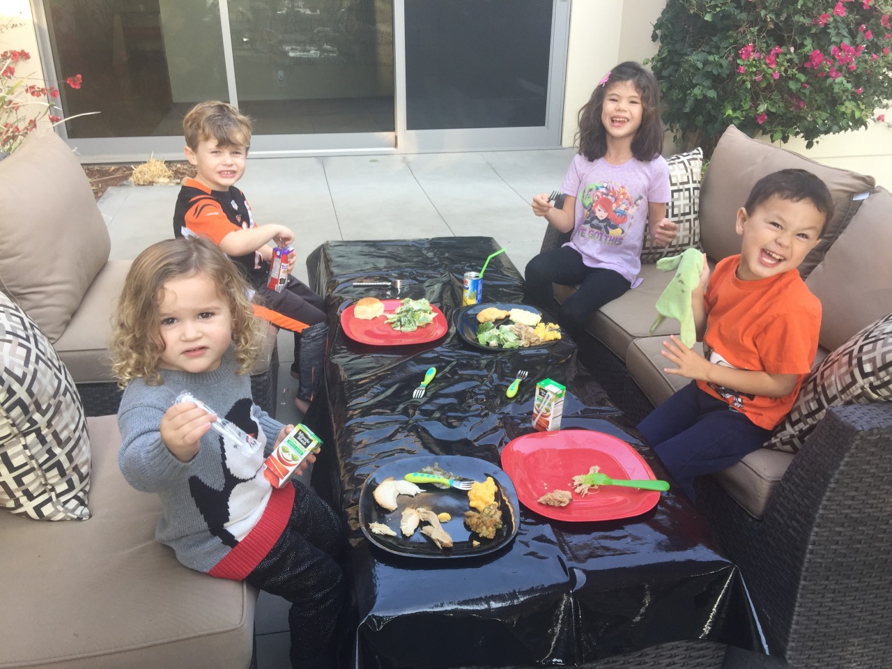 We ate Thanksgiving dinner this year on the back patio. Kids table was clearly the place to be.